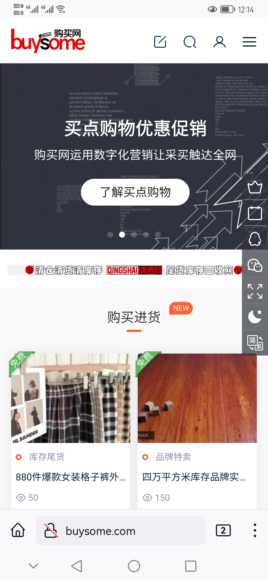 最近清晒网后台收到很多清货网友的留言,其中有一条提问到:哪一个平台可以批发尾货?那么今天全网清货平台就为大家推荐一个可以批发库存尾货的平台购买网,购买网的网址是www.Buysome.com大家可以直接在浏览器输入购买网的网址,直接进入购买网官网。